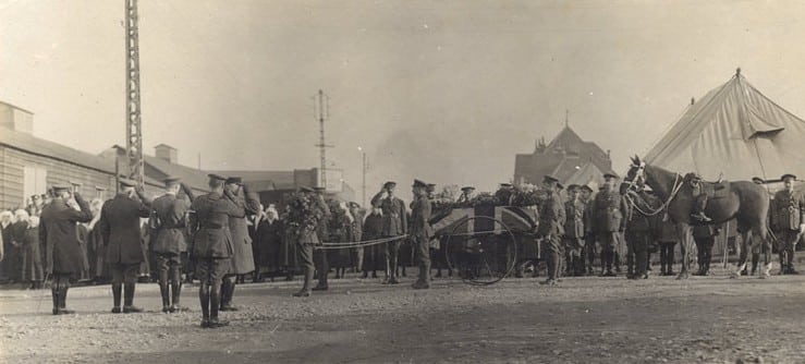 After reaching the battlefields of Europe, McCrae had an unsatisfactory horse. However, a medical colleague back in Canada shipped a horse over to McCrae, an animal that was fast and sure-footed, and this chestnut horse became McCrae’s much-loved companion and was named Bonfire. When the stresses of war became too much, McCrae would often ride Bonfire at night, away from the mud and horror of the trenches. To him, the horse was a symbol of beauty and decency in a world that had gone mad. His letters home to nieces and nephews were signed with a horseshoe, reporting regularly on Bonfire’s well-being and activities, with the horse credited as author of the epistles. Bonfire was very fond of blackberries and would stop to nibble them in the hedgerows whenever he got the chance. Man and horse had a very close bond: “All the hard spots to which one’s memory turns the old fellow has shared though he says so little about it.”